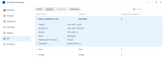 3) Nyní se můžeme zpátky podívat do Container Manageru > Síť, kde uvidíme naši nově vytvořenou virtuální síť.